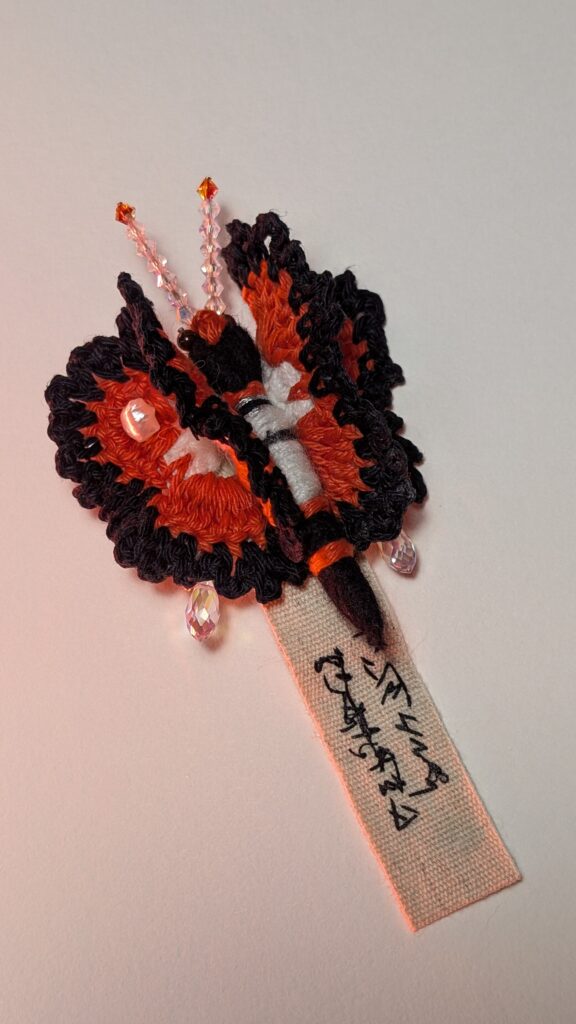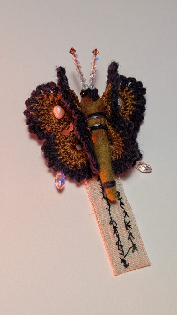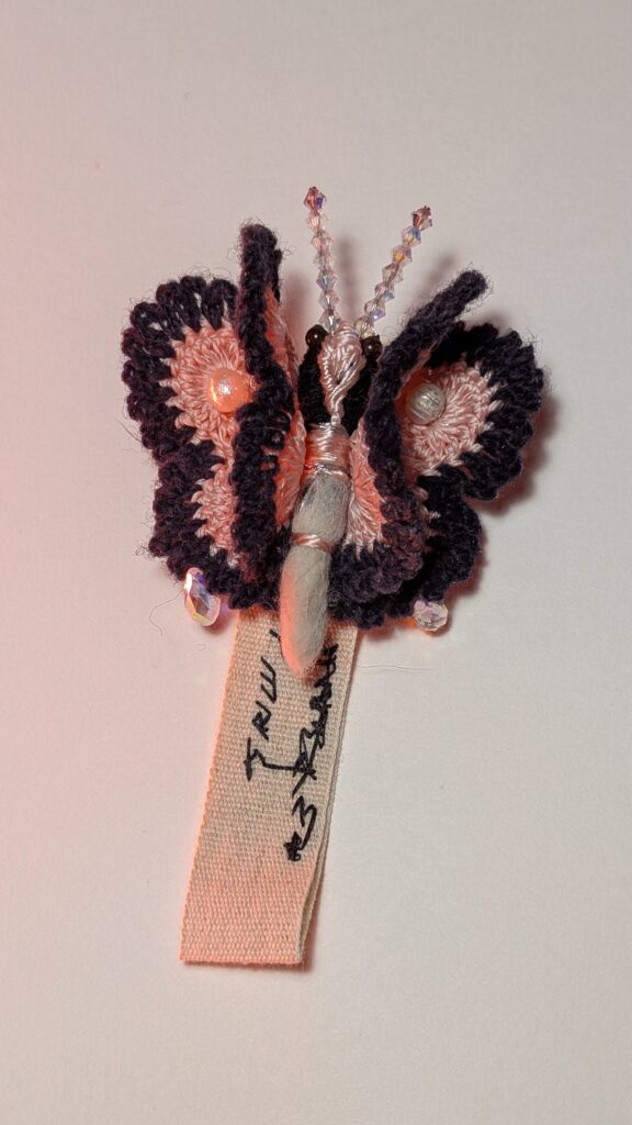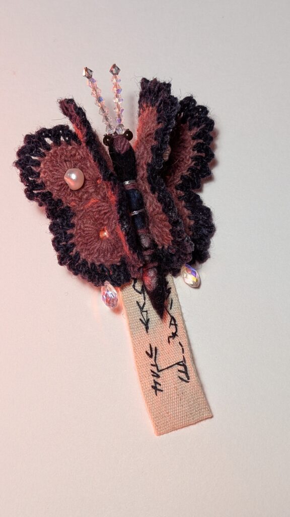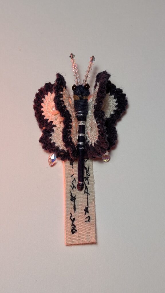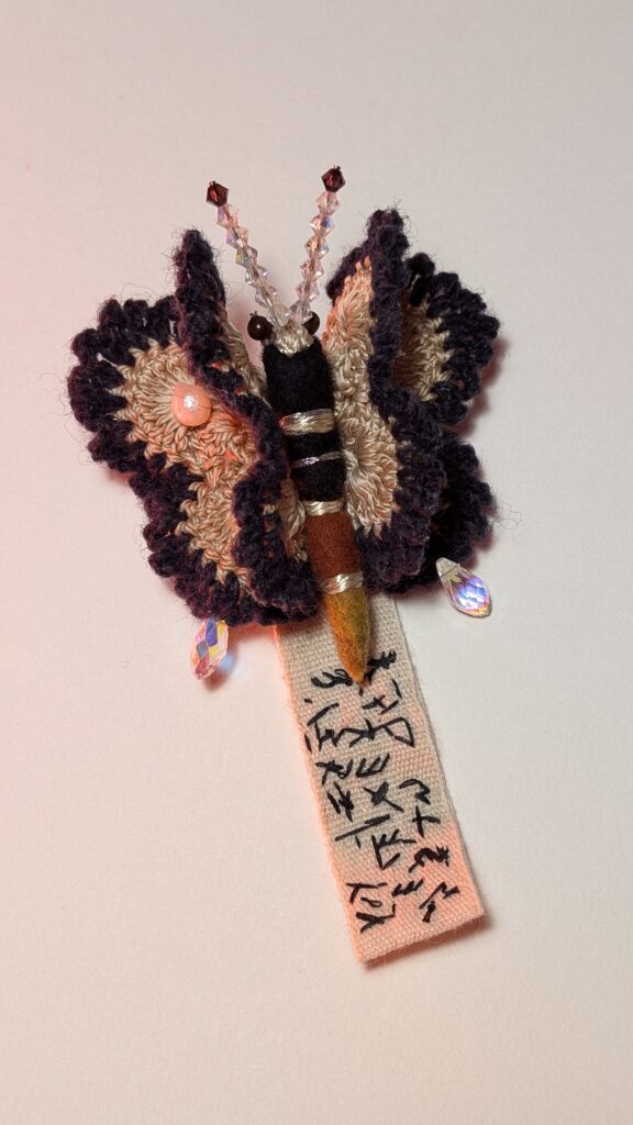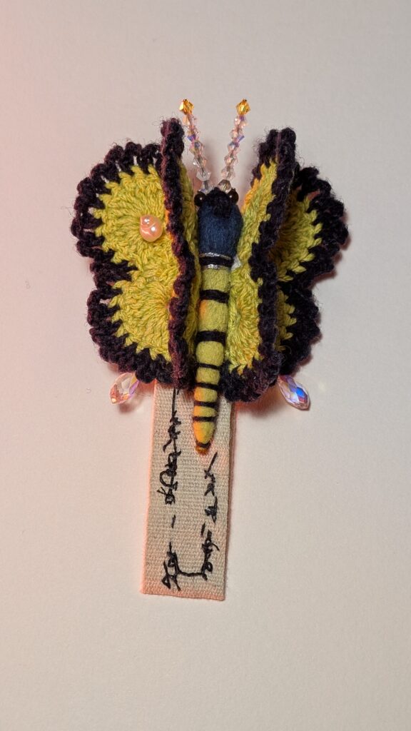 Agarrei-me a essa imagem como quem segura um fio. E iniciei um gesto sistemático, quase ritual: crochetei borboletas-alfinetes em algodão, lã e seda. Por que o número de vinte e uma borboletas? Porque o corpo pediu, no tempo da sincronicidade. Cada uma nasceu como uma cápsula de informações que narram relações. Elas carregam as cores do que vi, e, muitas vezes, sem olhos; as texturas do que toquei, os sabores do que comi, os pensamentos que me atravessaram no cansaço e na vigília.
