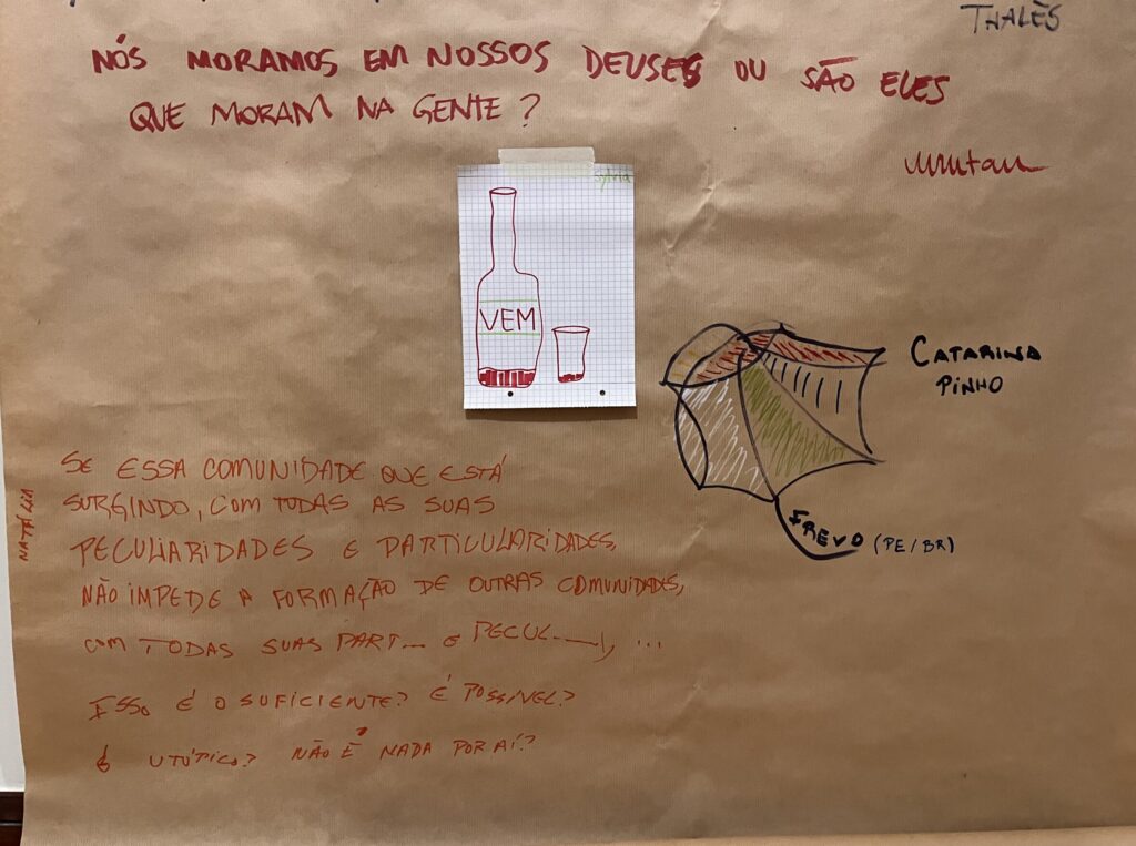 Gaia Ginevra Giorgi: non ho visto la performance. DORMIVO PERCHÉ ERO SFINITA. provo a immaginarla a partire dalle parole delle mie compagne. questo mi fa pensare a un progetto che avevo realizzato molti anni fa con il collettivo di performance. la nostra università si trovava proprio accanto a una scuola materna. avevamo organizzato un festival di performance e avevo deciso di affidare la comunicazione ai bambini. allora gli avevamo raccontato le performance avevamo programmato e loro le avevano disegnato a partire dalle nostre parole. ho fatto lo stesso quest’estate per un progetto intitolato erbario fantastico. ho inventato un erbario di piante alofile delle laguna di venezia e ho chiesto a un’illustratrice di disegnarle a partire dalle mie parole. per scrivere mi ero ispirata al dizionario delle amanti di monique wittig.
